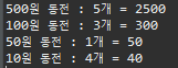 System.out.println(coinUnit[i] + "원 : " + coinNum + "개");