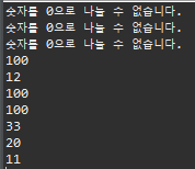 System.out.println("숫자를 0으로 나눌 수 없습니다.");