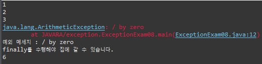 System.out.println("finally를 수행해야 집에 갈 수 있습니다.");