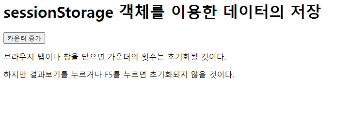 document.getElementById("counter").innerHTML = "카운터의 현재 횟수는 " + sessionStorage.clickcount + "이다.";
