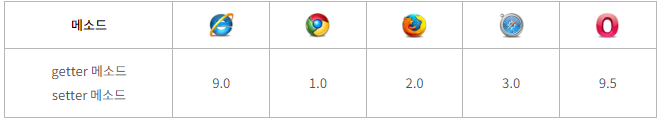 getter와 setter 메소드를 지원하는 주요 웹 브라우저의 버전은 다음과 같다.